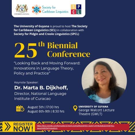 Professor Marta Dijkhoff, Director of the National Language Institute of Curacao, former Minister of Education and the Secretary General of the Ministry of Education in Curacao, will be the keynote speaker at the Conference. Other high-ranking persons scheduled to address the conference are UG’s Vice-Chancellor Professor Paloma Mohamed Martin and President of the SCL, Dr. Clive Forrester.